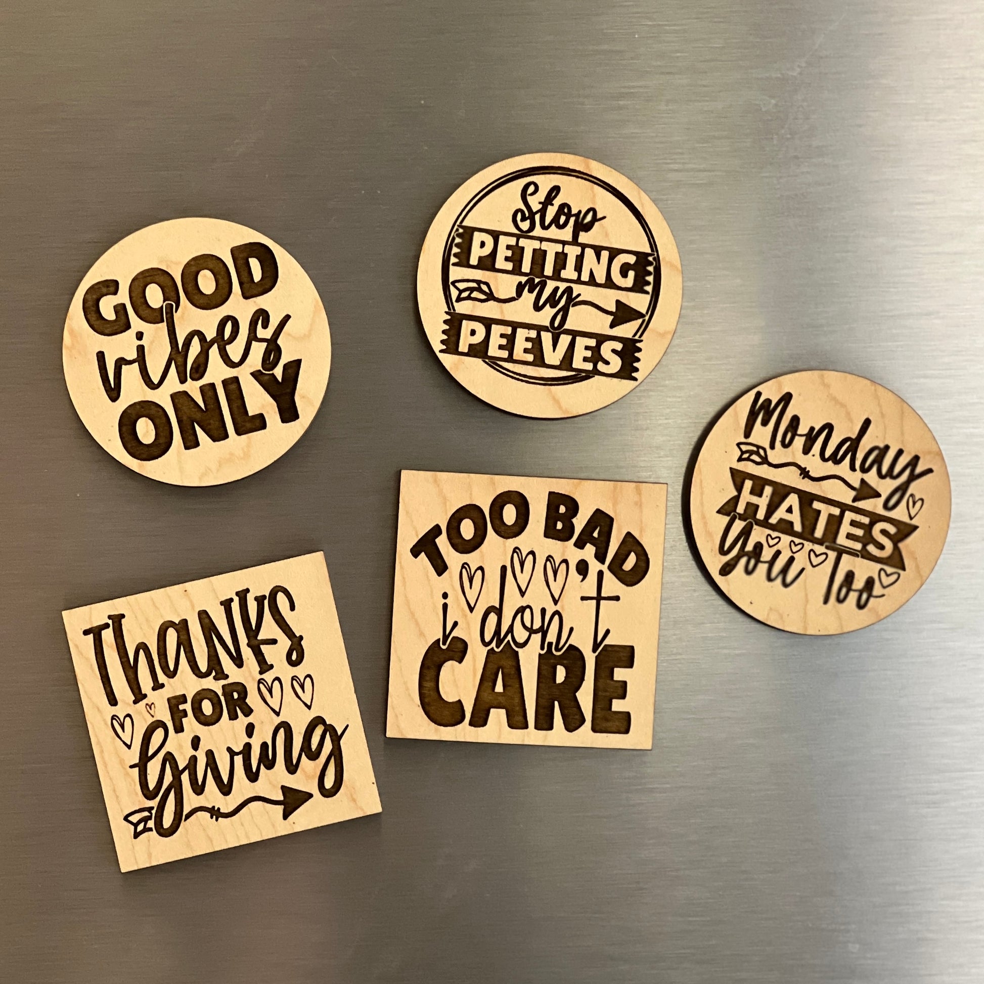 Funny, natural wood fridge magnets - 2.25" wide x 1/4" thick - Phrases that will make you smile, maybe even giggle.